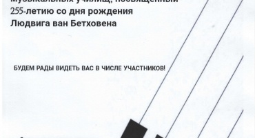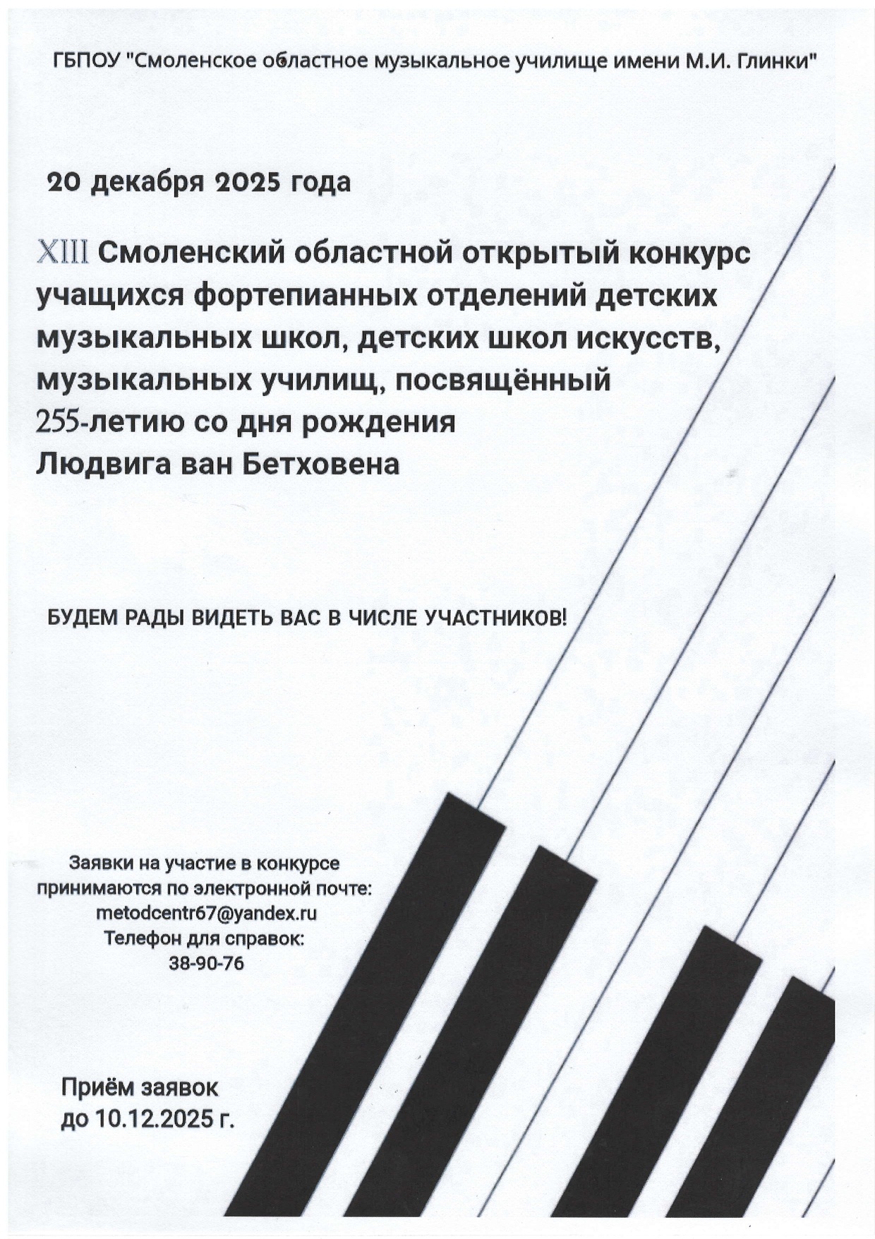 Приглашаем принять участие в XIII Смоленском областном открытом конкурсе учащихся фортепианных отделений детских музыкальных школ, детских школ искусств, музыкальных училищ, посвященный 255-летию со дня рождения Людвига ван Бетховина, который состоится 20 декабря в музыкальном училище имени М.И. Глинки.