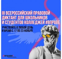III Всероссийский правовой диктант #ВПРАВЕ стартовал. Проект помогает школьникам и студентам колледжей в возрасте от 12 до 18 лет проверить знания своих прав и уверенно применять их в жизни. Диктант уже начался — пройдите его в любое удобное время с 17 по 23 ноября!