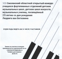 Приглашаем принять участие в XIII Смоленском областном открытом конкурсе учащихся фортепианных отделений детских музыкальных школ, детских школ искусств, музыкальных училищ, посвященный 255-летию со дня рождения Людвига ван Бетховина, который состоится 20 декабря в музыкальном училище имени М.И. Глинки.