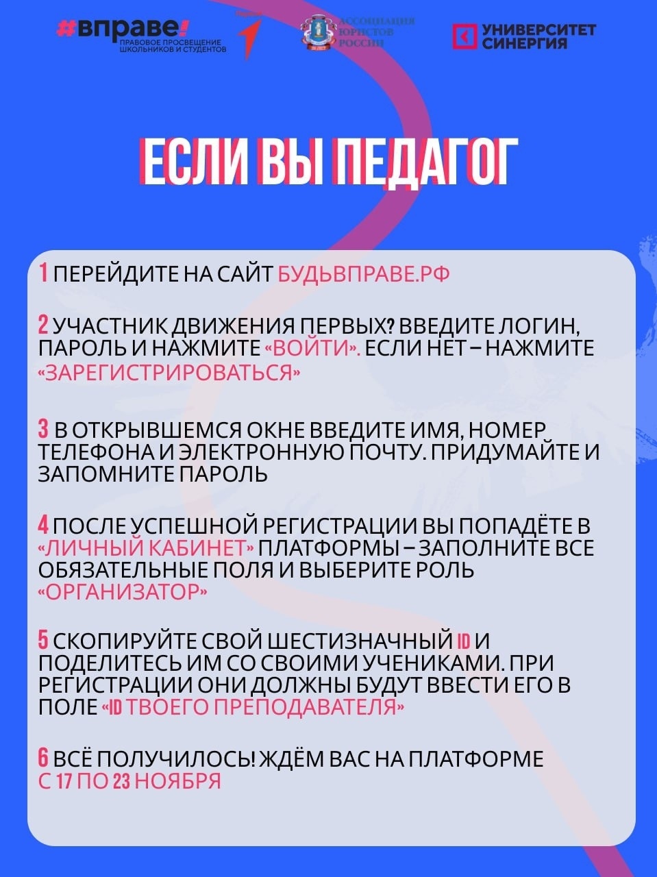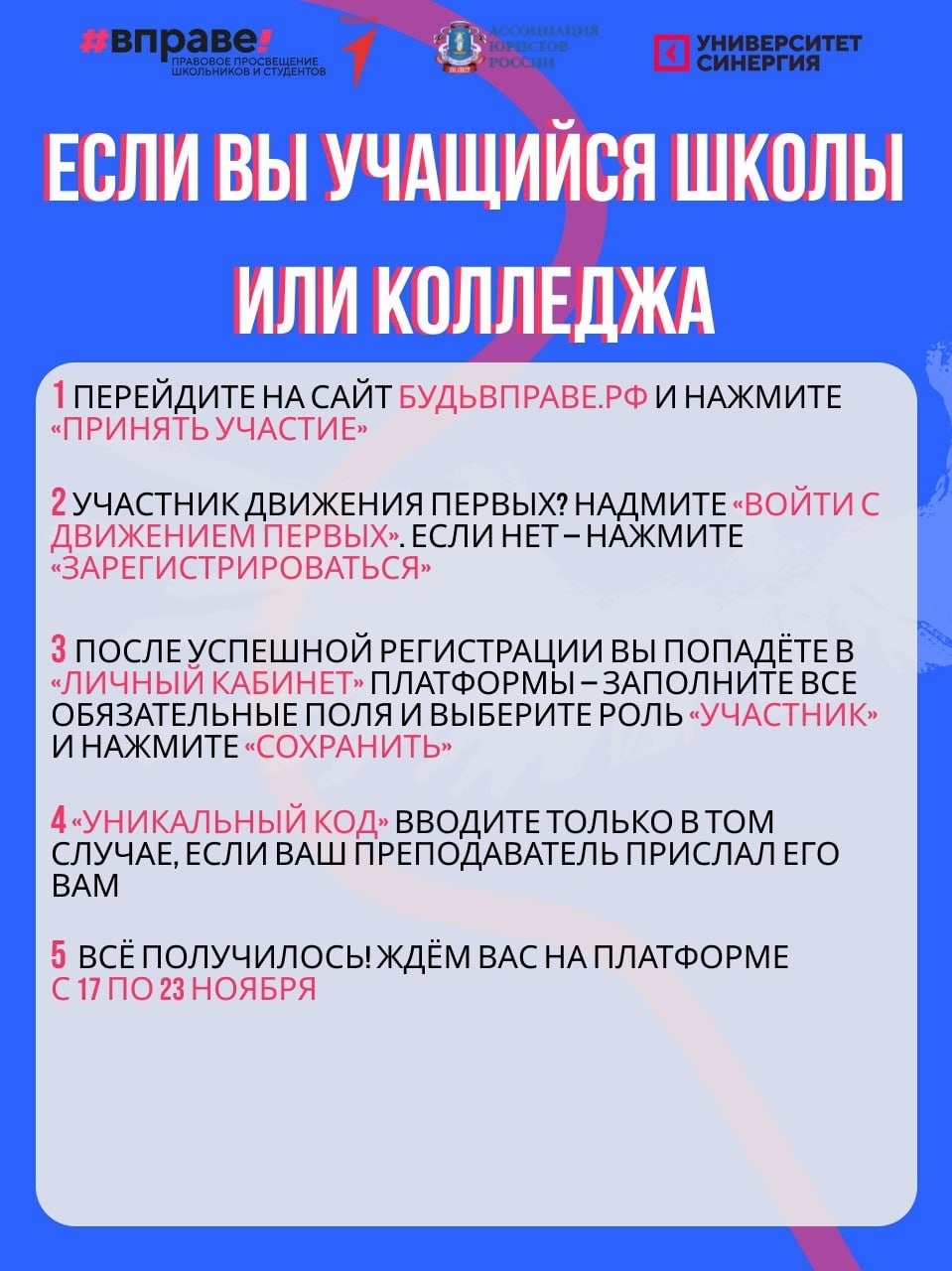 Поддержите инициативу и пригласите своих друзей — вместе мы усиливаем правовую культуру и делаем её частью школьной и студенческой среды!